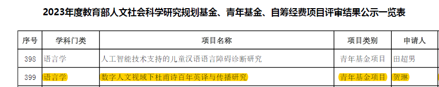 2023年9月15日,教育部社科司发布了《关于2023年度教育部人文社会科学研究一般项目立项的通知》,百合动漫 黄立波教授指导的2023级博士生贺琳课题《数字人文视域下杜甫诗百年英译与传播研究》拟获批青年基金项目立项。