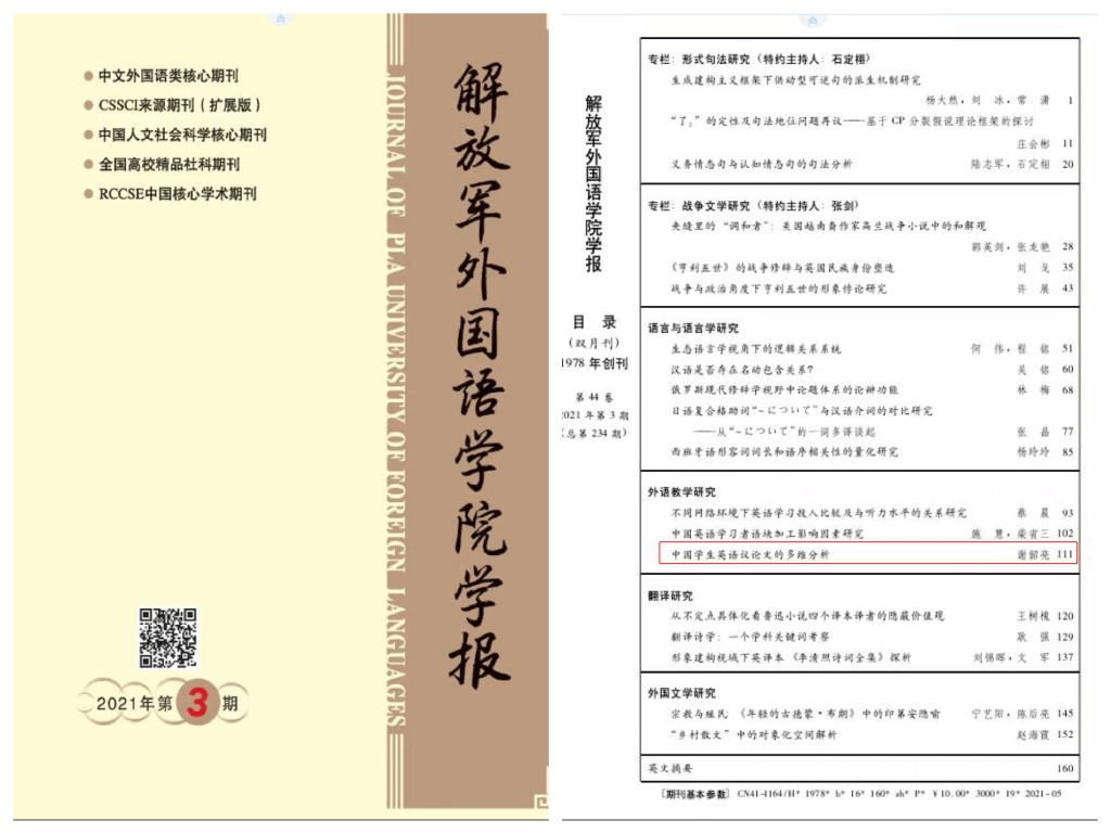 谢韶亮博士在《解放军外国语学院学报》2021年第3期上发表题为“中国学生英语议论文的多维分析”的学术论文。