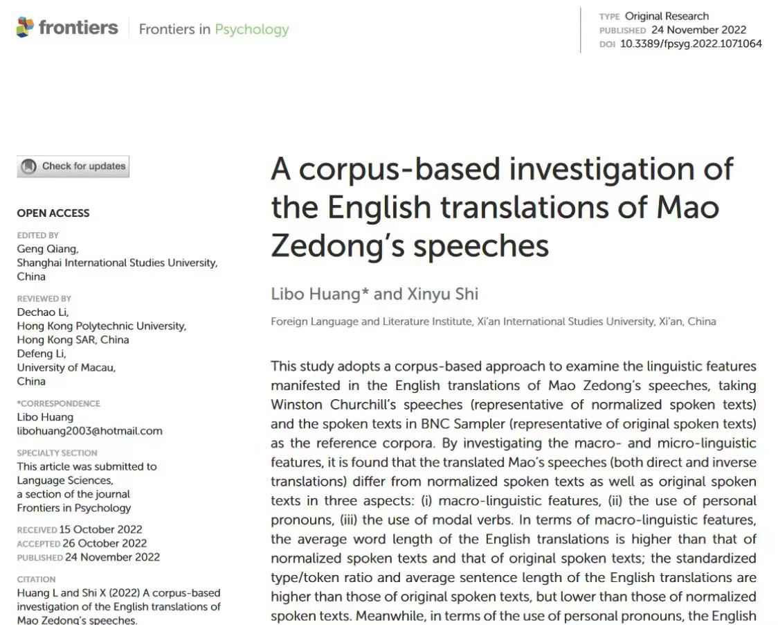 黄立波教授、石欣玉博士在Frontiers in Psychology上合作发表题为“A corpus-based investigation of the English translations of Mao Zedong’s speeches”的学术论文。