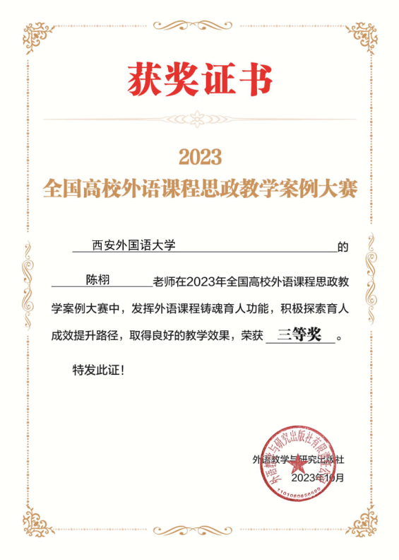 近日,由外语教学与研究出版社举办的全国高校外语课程思政案例教学大赛获奖名单公布,百合动漫 陈栩副教授荣获三等奖。