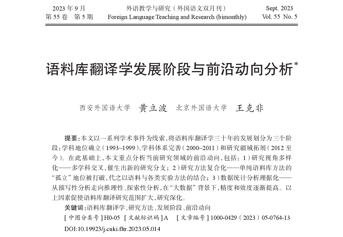黄立波教授与北京外国语大学王克非教授在CSSCI来源期刊《外语教学与研究》上合作发表了题为“语料库翻译学发展阶段与前沿动向分析”的学术论文。
