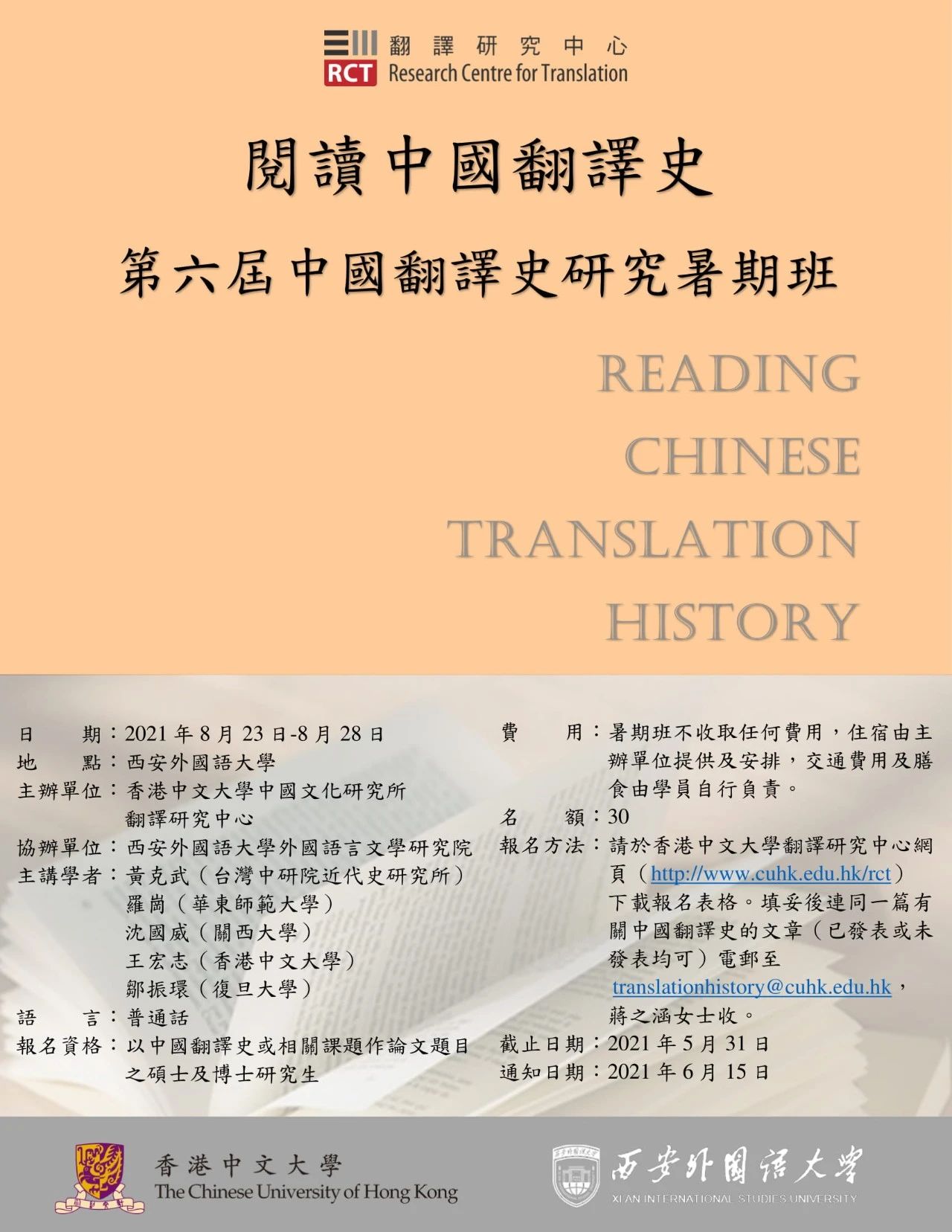将与香港中文大学中国文化研究所合作举办第六届中国翻译史研究暑期班,详情如下: