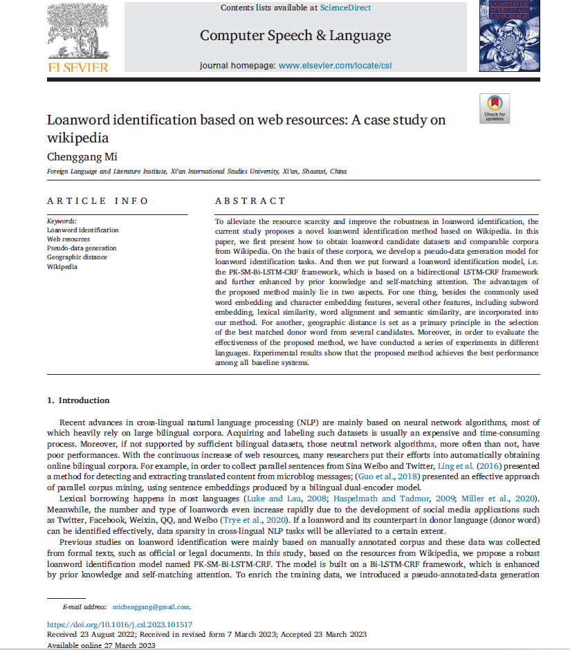 米成刚博士在《Computer Speech & Language》2023年第81卷上发表题为“Loanword identification based on web resources: A case study on wikipedia”的学术论文。