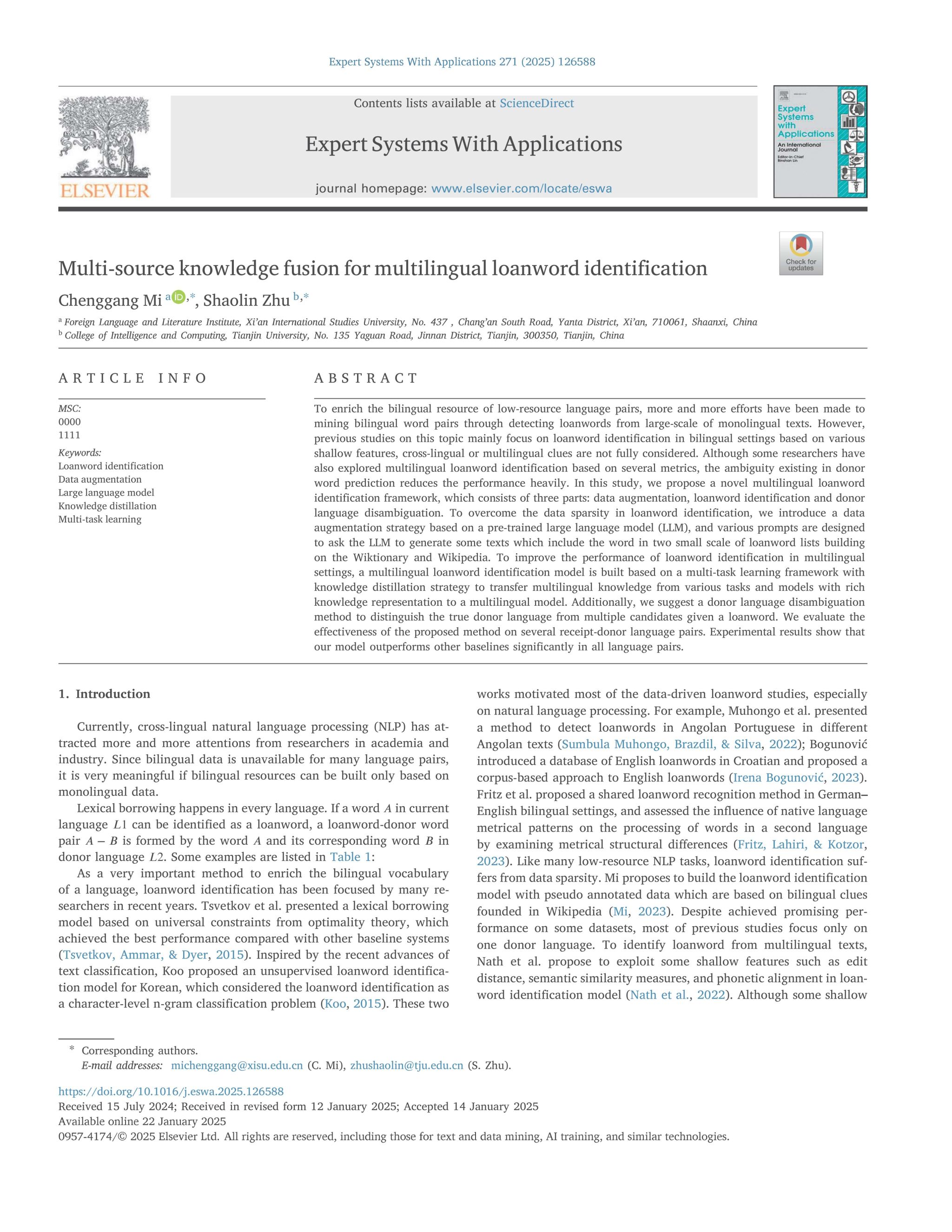 外来词(Loanwords)是低资源语言对双语资源扩展的重要来源。通过从大规模单语文本中挖掘外来词词对,能够有效地缓解低资源语言对双语语料匮乏的问题。然而,传统研究多侧重于双语环境下的浅层特征识别,忽视了跨语言或多语言线索的深度整合,且在预测donor language时存在严重的歧义问题。针对上述挑战,论文提出了一种新颖的多语言外来词识别框架。该框架由三个核心模块组成:一、基于大语言模型的数据增强:通过设计多样化的提示词(Prompts),结合维基词典(Wiktionary)与维基百科(Wikipedia)中的少样本数据,基于预训练大模型生成包含目标外来词的高质量上下文文本。二、融合知识蒸馏的多任务学习模型:基于多任务学习架构,并引入知识蒸馏策略,将具备丰富知识表示的多个任务与模型中的多语言知识迁移至统一模型中,显著提升了多语言环境下的识别精度。三、宿主语言消歧机制:针对一个外来词可能对应多个候选donor language的情形,设计了一种消歧方法,能够准确判定候选外来词的donor language。实验结果表明,该方法在多个“target language-donor language”语言对上的表现均显著优于现有基线系统。