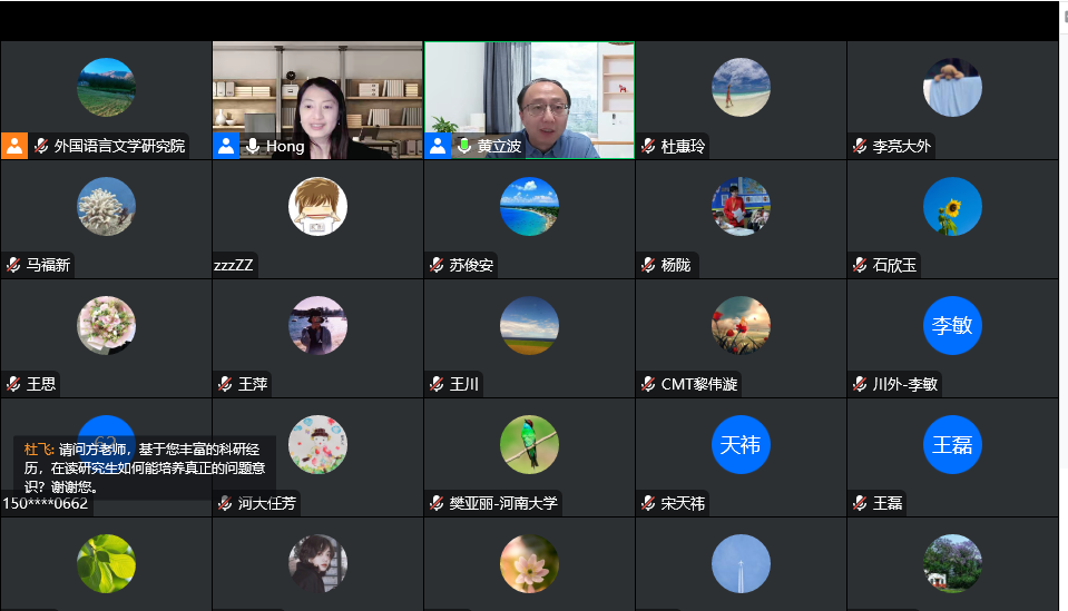 讲座后期,黄立波教授对讲座进行了总结。黄教授指出:方红教授从翻译史研究“以人为本”这一理念出发,先后介绍了利玛窦其人和其《交友论》著译,并在此基础上就相关现象进行了文化史意义上的阐释。该研究脉络清晰,个案分析细致深入,可为相关研究提供有益参照。最后,方红教授就线上听众提出的问题做出了详细解答,并强调:在翻译史研究过程中,应当仔细考察相关副文本,以还原译本所处的历史语境。本研究中历史语境的还原即有赖于对《利玛窦书信集》及《利玛窦中国札记》等书的细读。同时,在研究对象的选取过程中,翻译研究者可以适当拓宽视野,不囿于对自身已掌握的语言相关的文本的考察,亦可在描写译学思想的指导下,就以其它语言译写而成的作品展开探索。