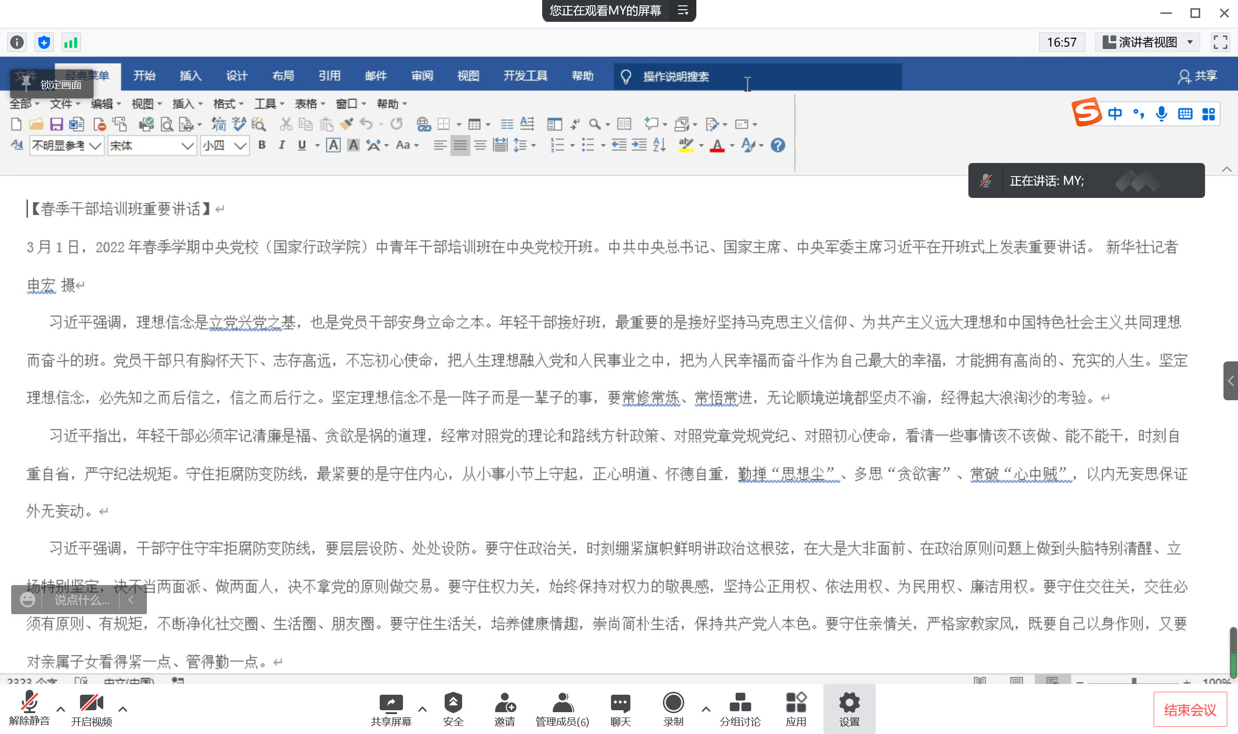 随后,米钰副书记对习近平总书记在2022 年春季学期中央党校中青年干部培训班开班式上的重要讲话精神进行了领学。其指出,习近平总书记在讲话中强调:“理想信念是立党兴党之基,也是党员干部安身立命之本”、“干部守住守牢拒腐防变防线,要层层设防、处处设防”、“树立和践行正确政绩观,起决定性作用的是党性”,习近平总书记的讲话从党和人民事业后继有人的战略高度,对我们年轻干部提出了重要要求,表达了殷切期望,为广大年轻干部的成长发展指明了方向,作为年轻党员干部,我们要深入学习领会、坚决贯彻落实,筑牢理想信念根基,为实现中国特色社会主义共同理想而奋斗。