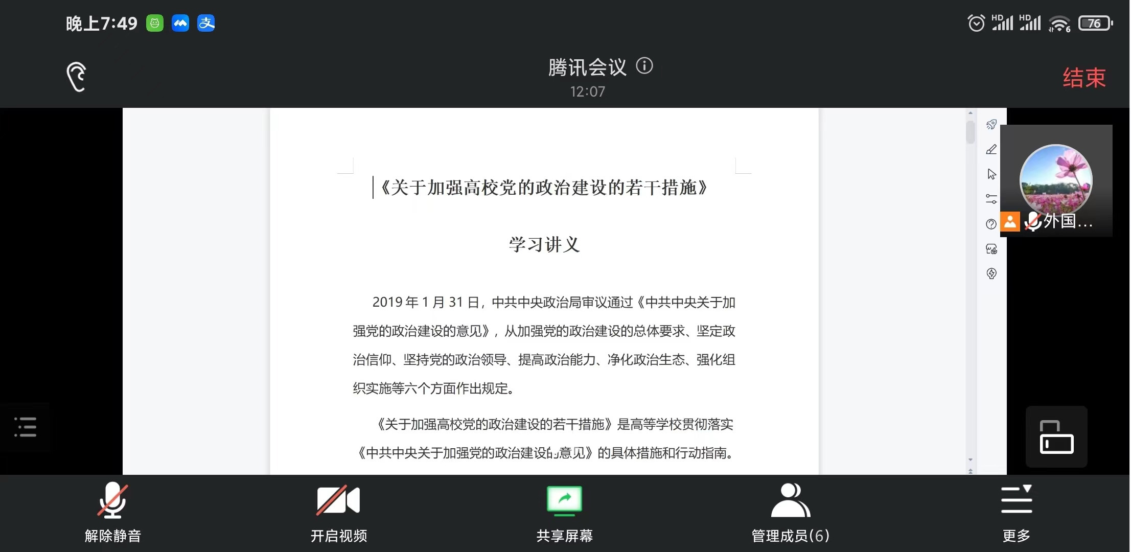 首先,支部书记黄立波教授对《关于加强高校党的政治建设的若干措施》进行了领学,其指出,该措施依照《中共中央关于加强党的政治建设的意见》的相关要求,从加强党的政治建设的总体要求、坚定政治信仰、坚持党的政治领导、提高政治能力、净化政治生态、强化组织实施等六个方面给出了具体措施与行动指南。我们党员教师要坚持党的全面领导,增强“四个意识”、坚定“四个自信”、做到“两个维护”,落实立德树人根本任务,培养社会主义建设者和接班人。
